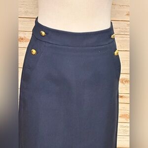 Navy blue w/ gold button detail; 1.75” waistband; two front side pockets; hidden back zipper; fully lined; straight hem