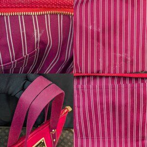 Authentic LV Cabas Antigua cloth and leather tote with super vibrant red exterior, purple handles, iconic Louis Vuitton marque plaque on front, striped interior. Fabulous shopping tote that fits a lot. This is the medium sized one and perfect for everyday needs. Longer handles lets you carry your Louis Vuitton over shoulder or over arm.