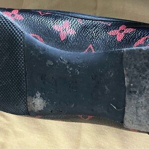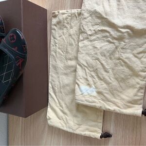 dusty inside and outside from being stored for an extended period of time, feels stiff, wear on soles, dirty on soles, heels worn down, creased, marks on insole, scratches on canvas, BLEACH MARK ON DUST BAG, scratches/marks on brown box, color coming off black leather trim on the outsides of shoes, front part of bottom sole has been resoled on both sides, hasn't been worn in a few years