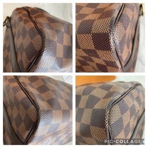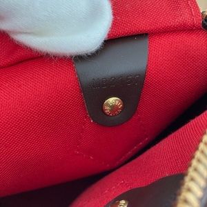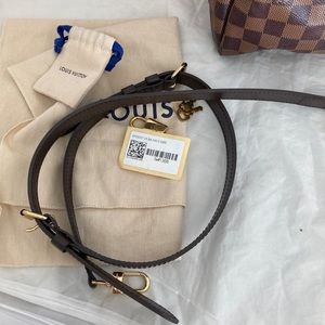 Authentic, Louis Vuitton Speedy 25 Bandouliere in Damier Ebene. Excellent condition, as bag was only carried a handful of times. Corners show no wear, no scratches to leather, no wrinkling of strap. Canvas in excellent condition, minimal scratches to hardware, if any. Handles are clean. Inside pristine with no stains or odor. Some tarnishing of hardware. Slight wear at side strap (last pic). Stock is always low on this item. Includes box, dust bag, lock and two keys, strap and barcode tag. Price is firm. #0412P207919.