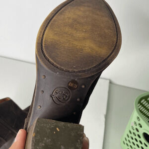•Upper suede leather, stacked heel, synthetic lining and rubber outsole.