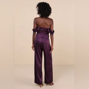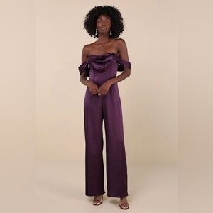 LULU’S Unbelievable Aura Dark Purple Satin Off The Shoulder Jumpsuit