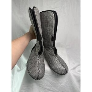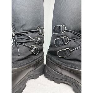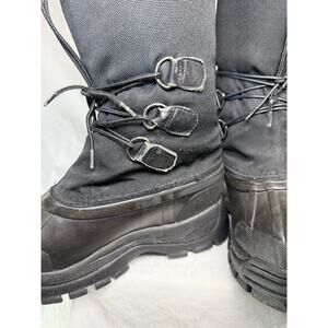 The one-piece injection-molded rubber shell is still 100 % waterproof; outer finish shows only faint scuffs from normal wear. Inside, 400 g Thinsulate insulation keeps you warm to approx. -25 °F; minor fleece pilling is present on the inner upper where the shafts touched during walking (see photo #5). 2-inch self-cleaning lug sole retains deep tread for grip on ice and packed snow. Women’s size 8, pull-on style with stretch snow collar, matte black. Photos show exact condition; no odors.