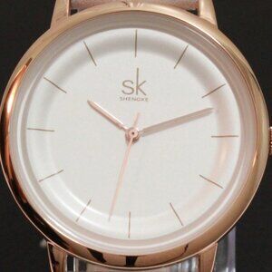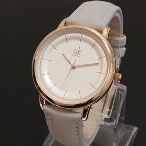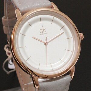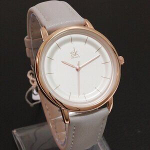 This ladies quartz dress watch features a domed white dial with rose gold tone indices in a rose gold tone 38mm case. It's held in place with a soft and easy to wear grey strap with silver tone buckle . It fits wrists up to 7 inches. This watch is new in box with tags and works as it should.