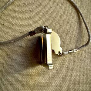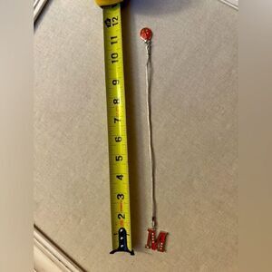 Red Ceramic Lady bug with 5 crystal "dots" surrounded by silver on her wings. On the other end is the red ceramic capital M also with crystals. Connected by a silver silk cord. Charms on each end are shiny silver most likely stainless steel with a solid weight. NWOT