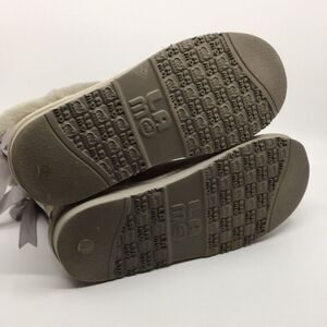 LAMO women’s Audrey Dove Grey winter suede and faux fur lined boots with ribbon detail at back of boot. Please note, I think that I have the color correct. The faux fur is like a taupish gray color. And the boots themselves are like a tan taupe color more tan than taupe. Size 9. In excellent preloved condition. The ribbon is showing up slightly lavender purple in the photos **please note** this is not accurate. It’s definitely more taupe gray in person.