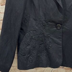 Business casual black blazer with floral embroidered beaded details, long sleeve, single button closure, fully lined. Tailored fit.