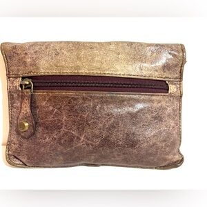 Vibrant interior with brown distressed leather accents. Latico branding inside. 6 compartment. 5 cards slots zip pocket back at logo at hardware lining have some stains hight 4.5” wide 7” The dimensions are based on approximately measurements before placing an order please check take a moment to view all photos using feature for a closer look
