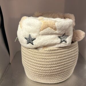 Laughing llama three-piece gift basket. Keep your little one cozy set include storage basket 9.5 inches stuffed animal and 35 x 29.5 blanket. This is an adorable set. Would make a nice gift for Christmas or a baby shower.