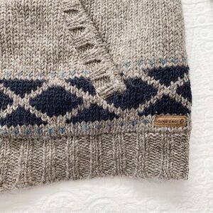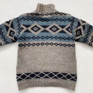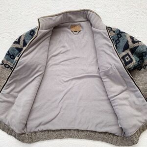 Full zip thick wool cardigan / jacket. Southwest geometric pattern. Front pockets. High collar and ribbed cuffs and bottom hem. 100% wool body, 100% polyester lining.
