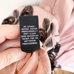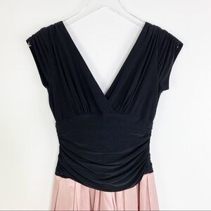 Worn once and freshly dry cleaned, this stunning dress features a v-neck and back black jersey top with gathered cap sleeves and a gathered empire waist. The skirt is slightly metallic mauve pink with elaborate embroidery and ribbon floral design encircling the full skirt. The skirt lining includes a tulle ruffle for fullness and swish. Back zip. Formal, prom, cocktails, wedding, special occasion. Holiday ready. Please see photos for additional details.