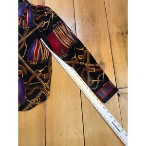 This Lauren Ralph Lauren button-up shirt features a beautiful equestrian bridle horse print. It's a vintage-inspired piece perfect for adding a touch of classic style to your wardrobe. The shirt is in great condition and ready to wear. This shirt features: