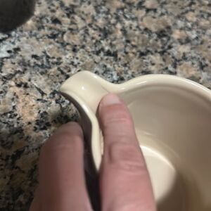 Bought for decoration and never used. No box. There’s no chips at all! Tiny flaw or rub in pour part of milk jug as shown but it came from store this way.