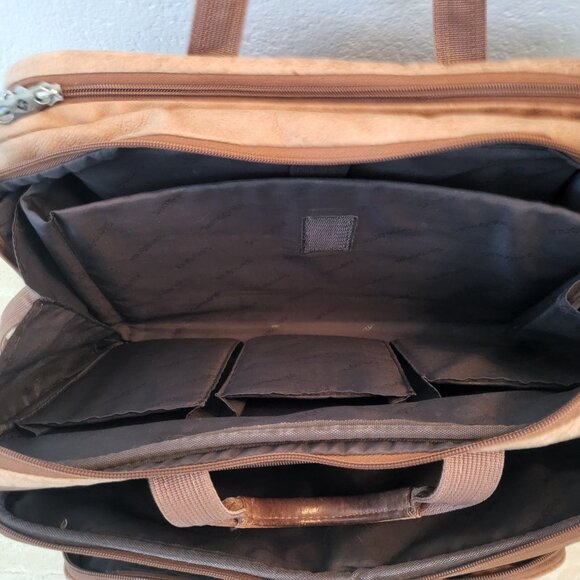 Light brown briefcase that has a padded laptop compartment. Three large compartments that include a file organizer, pen pockets, etc. One medium compartment and four small compartments. All zippers in excellent condition. Smart sleeve to secure bag to/on top of rolling suitcase. Attached shoulder strap and handles for carrying.