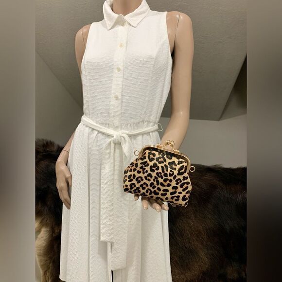 Vintage style. It’s very cute and exquisite small clutch, handmade from hair-on-horsehide leather with kisslock closure, beautiful leopard printed. Includes 2 chain styles, use in multiple ways, can be used as a coin pouch, wristlet or crossbody. spacious enough for keys, bank cards, coins, cosmetics.