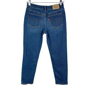 Levi's Mini Mom jeans in girls size 12 regular. Zipper and button closure. Five pockets. Adjustable waist size. Distressed, stretchy 69% cotton 28% polyester 2% viscose 1% elastane. Machine washable. Great condition!