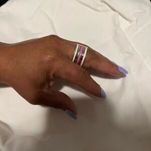 Lia Sophia SilverTone Pink & White Stripe Enamel Band Statement Ring Size 10