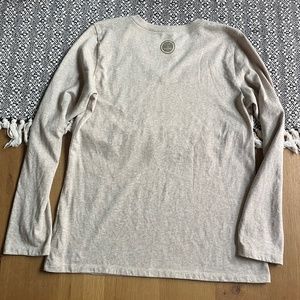 EUC Life Is Good brand women's grey long sleeve "Crusher Tee" with "Pumpkin Spice & Everything Nice" fall graphic design. Featuring red, yellow, orange, and green leaves on heathered grey base. Comfy and casual, soft classic fit. V-neckline. From their website: "Slight waist shape, cotton/spandex rib at neck, and self-fabric taping from shoulder to shoulder."