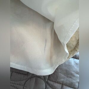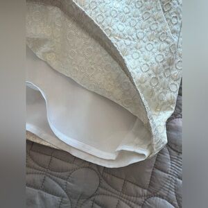 This gold metallic shirt has an angled waistband, slanted pockets and a side zipper. So flattering and chic.