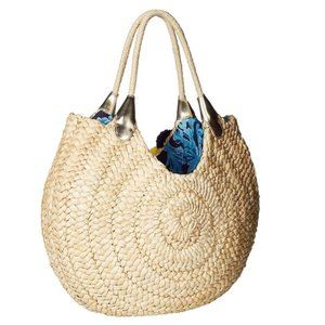 A too cute tote for landlocked or seaside adventures. Straw tote bag features pom-pom trim and logo embroidery with xx Lilly logo. Rounded shape. Printed woven rayon voile lining. Interior wall pocket. Spot clean. Imported. Approximate Measurements: Bottom Width: 14 in Depth: 4 1⁄2 in Height: 12 in Strap Length: 22 in Strap Drop: 11 in Weight: 1 lb 4.8 oz