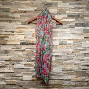 Brighten up your look with this authentic Lilly Pulitzer “In the Vias” Riley Infinity Scarf, featuring an iconic tropical floral print in vibrant hot pink and green on a soft light blue background. Made from lightweight 100% rayon, this scarf is soft, breathable, and perfect for layering through spring, summer, and resort seasons.
