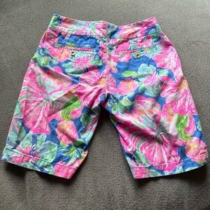 The Lilly Pulitzer The Chipper Short 10' Jungle Utopia Bermuda shorts in size 2 are a stylish and comfortable option for casual occasions or travel. Made from lightweight cotton fabric with a medium wash, these multicolor floral shorts feature a zip closure, flat front, and pockets for convenience. With a 10-inch inseam and regular fit, these Bermuda shorts are perfect for summer, fall, and spring activities such as walking, beach outings, and even golf. Easy to care for and machine washable, these Lilly Pulitzer shorts offer both fashion and functionality in a vibrant jungle themed design.