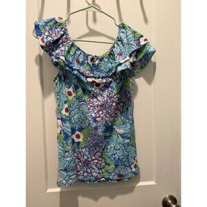 Lilly Pulitzer Womens Wynne Casual Top Blue Floral Short Sleeve Off Shoulder M
