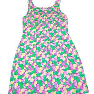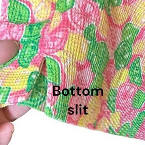 Lilly Pulitzer size 6 sheath dress Vibrant dress with a lemon and lime motif print. Features pink, yellow, and green colors, back zipper. Needs stain treatment for underarm piping.