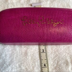 Lilly Pulitzer Pink Hard Case Eyeglasses Case. Great used condition. Gold lettering. Blue interior with one small flaw top interior edge, please see photos. Measures approximately 6.5”x2.5”.