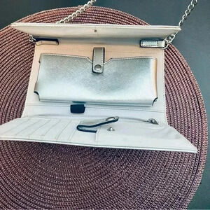 This bag has enough room for cellphones and a spot to your charger cord. The size is she has minor signs of wear and made of textured faux leather. This bag has a