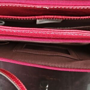 Liz Claiborne's classic red crossbody bag has three large separate compartments,one outside open compartment, and an adjustable shoulder shoulder strap.