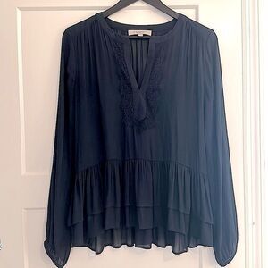 Beautiful rich navy blue blouse with v neck lined in lace. Layers of Ruffles on lower part of blouse give it a bohemian feel while still looking sophisticated. Elastic cuffs.