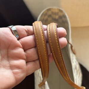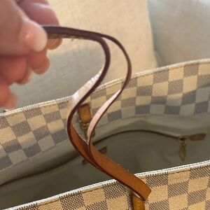 Stylish Louis Vuitton tote with iconic Damier Azur pattern. Cream and tan colors. Perfect for everyday elegance.