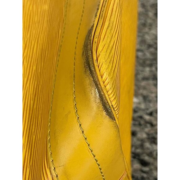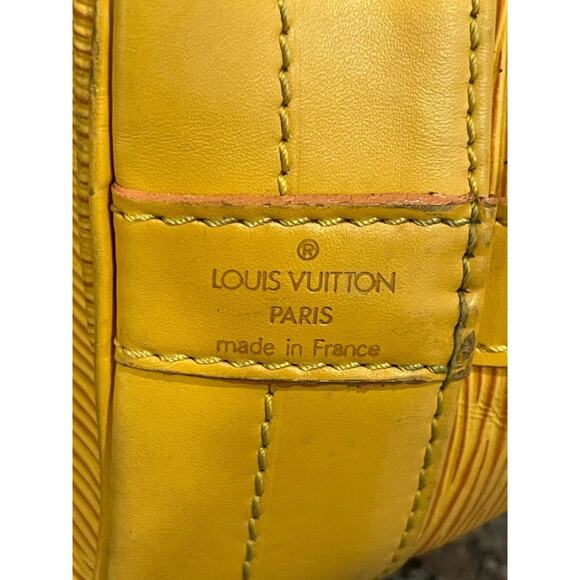 THE LOUIS VUITTON EPI PETIT NOE TASSEL YELLOW AND PURPLE IS IN USED CONDITION. THE EXTERIOR HAS SCUFFS AND SCRATCHES. THE INTERIOR HAS SMALL STAINS THAT ARE HARD TO PICTURE. THE BAG DOES NOT COME WITH BOX OR DUSTBAG. THE OVERALL CONDITION OF THE BAG IS A (C-).