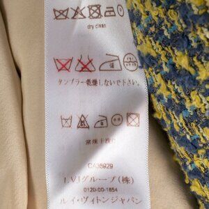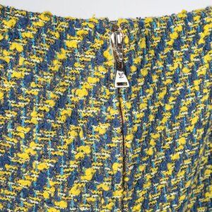 Made in France, this skirt from Louis Vuitton's 2014 Resort collection is crafted in a yellow and blue cotton-blend tweed, and features front patch pockets, a mini-length hem, side slits, fringed trim, a back zip closure, and is lined in a champagne silk.
