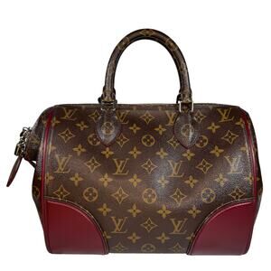 • Features monogram coated canvas, silver-tone hardware, maroon red leather trim, rolled handles & adjustable shoulder strap, alcantara suede lining & several interior pockets, top zip closure, protective feet at base.