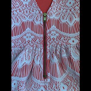 Lightly worn.  Well-structured dress.  Deep peach in color (see picture with size tag for best color representation).  Beautiful lacing throughout.  Zipper closure in back.  Size S