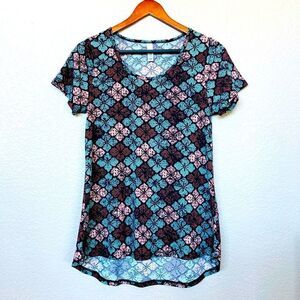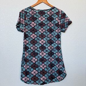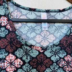 Women’s size XS LuLaRoe pattern top, slightly fitted through waist and loose along lower hem. Coral pink/red and teal blue/green color tones. Excellent like new condition.