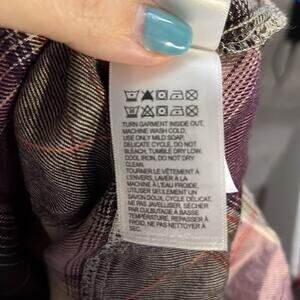 Plum purple plaid button down shirt. Long sleeves with one pocket on the front. Very soft and comfy. Longer back with a buttons at the bottom for a nice detail.