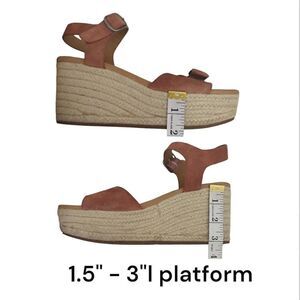 Gently used, espadrilles sandals, with a fun retro/ 70s inspired look! Suede straps, in a light rose (or pinkish) color. Open toe. Sling back, ankle buckle strap & top toe buckle strap- adjustable to your fit! Platforms, gives that extra lift, measuring from 1.5"- 3"l. Cushioned, comfort, footbed.