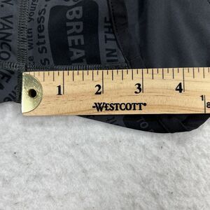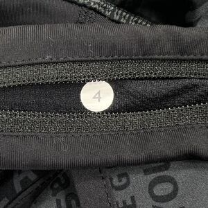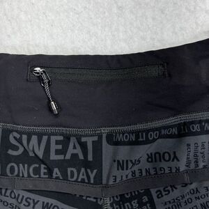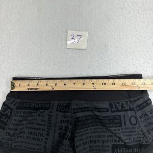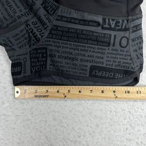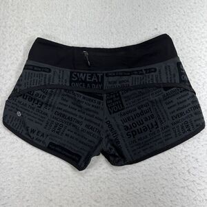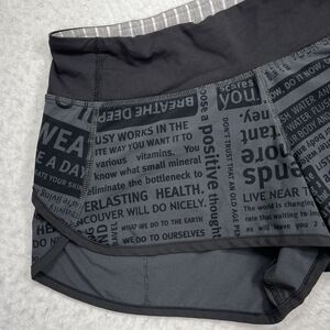 Great condition LuluLemon athletic 3" inseam Classic Running Manifesto shorts in a women's size 4 in black/gray with a repeating printed text/words design on the front & back and a black stretch drawstring in the waist.