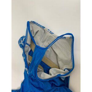 This is a blue lightweight racerback top with a built in sports bra that is white with blue flowers. It’s a size medium in great preowned condition. No stains or flaws.
