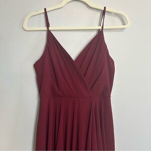 Elegant burgundy maxi dress with V-neckline. Ideal for formal occasions.