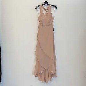 Blush color tulip hem long gown with extra long shoulder straps for configuring different ways to wear. Wear as criss cross back, twisted at the back or other ways.