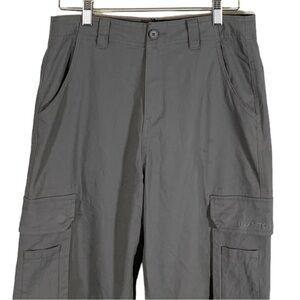 Features: Lightweight cotton blend fabric in gray. High waist. Relaxed baggy fit leg. Cargo  pockets. Side pockets. Drawstring bottom hem. Zip to button closure.
