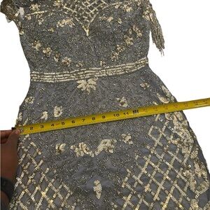 MAC DUGGAL EMBELLISHED BEADED SEQUINED FRINGE CAP SLEEVE GOWN SIZE 8 In Platinum Gold. Actual picture of dress included.