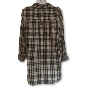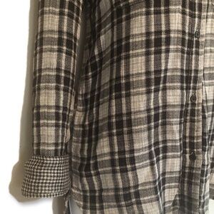 Lightweight long sleeved flannel from Madewell. Black and white plaid button up front with check print details in coordinating colors. Front chest pockets. Asymmetric hem. Loose fit.