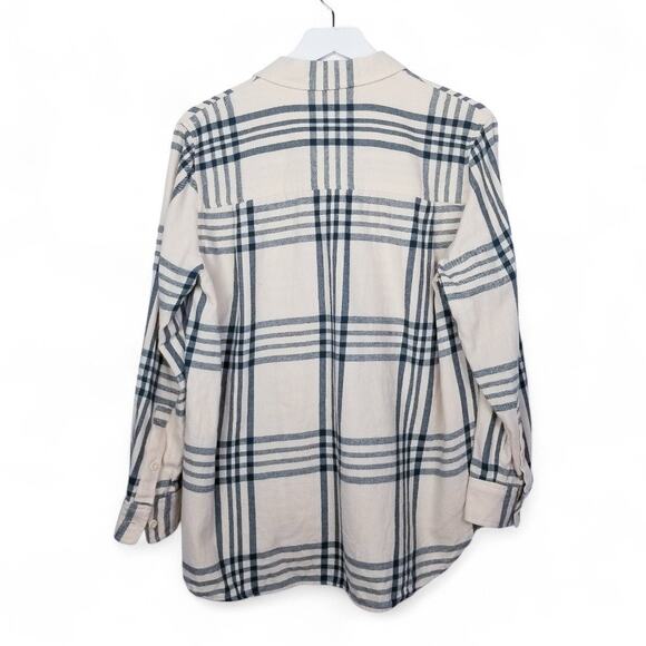 Madewell Oversized Boyfriend Swing Shirt in Windowpane. Shirttail hem and big patch pockets. Buttery soft windowpane flannel. Oversized fit. Cotton.
