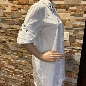 Elegant white dress featuring a stylish embellished collar and button-up design. Ideal for any occasion. 100% cotton. Made in Italy.  Size- 44. Size US- S/M.