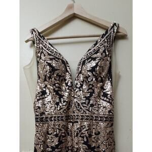 This stunning May Queen Couture dress is perfect for any formal occasion, whether it be a wedding, party, or cocktail event. The dress features a beautiful V-neckline and is sleeveless, making it perfect for any season. The backless design with a zipper closure adds a touch of glamour to the dress, while the solid gold/black color makes it easy to coordinate with other accessories.